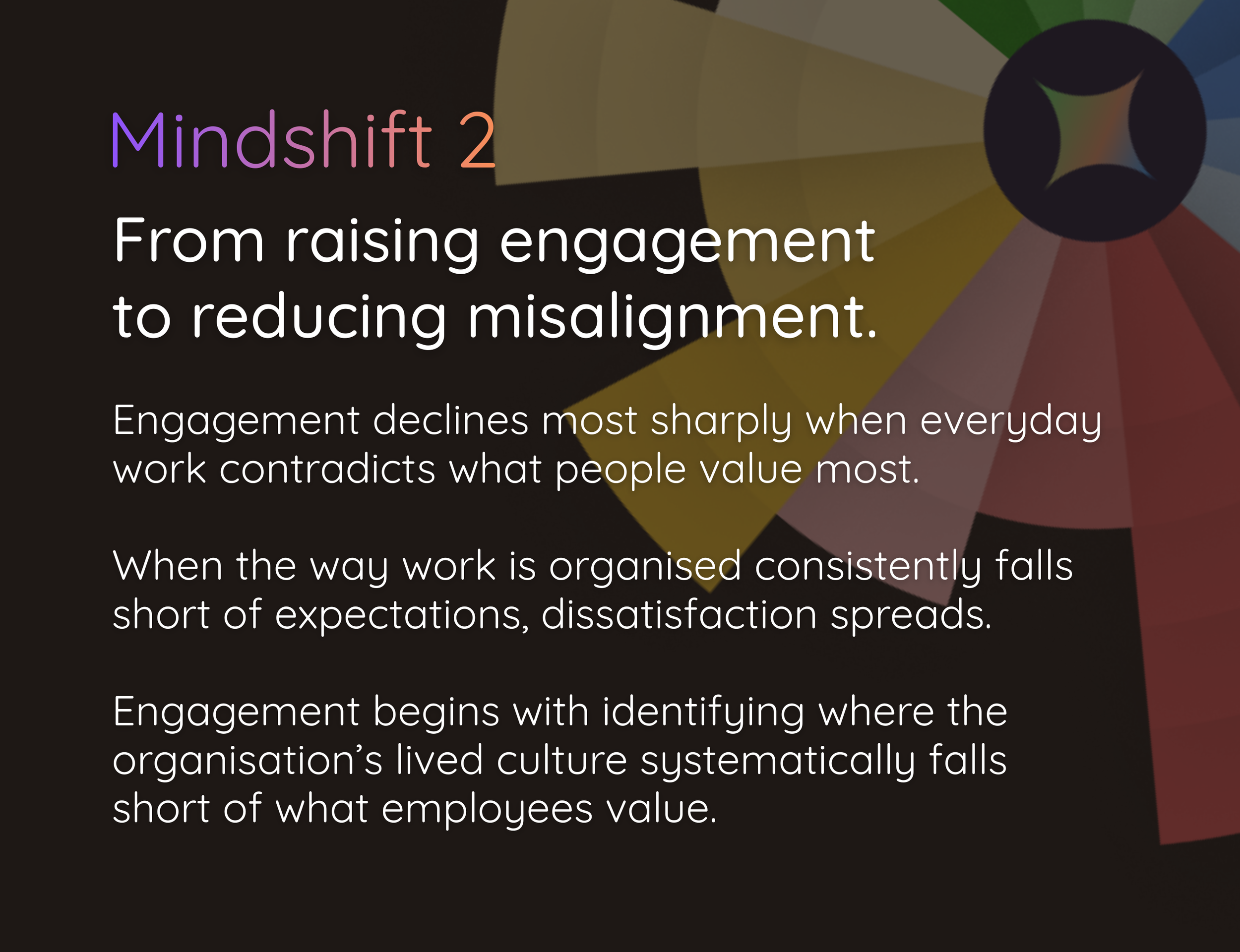 The research also highlights the important role culture plays in shaping engagement. While engagement is influenced by many factors, our work sheds light on how strongly it is affected by the way culture is experienced in everyday work. When the lived environment aligns with what people value, engagement is more likely to be sustained. When it does not, engagement can quickly erode. This perspective leads to three important MindShifts in how organisations understand the relationship between culture and engagement.